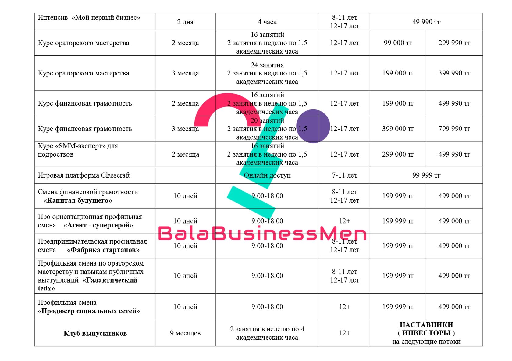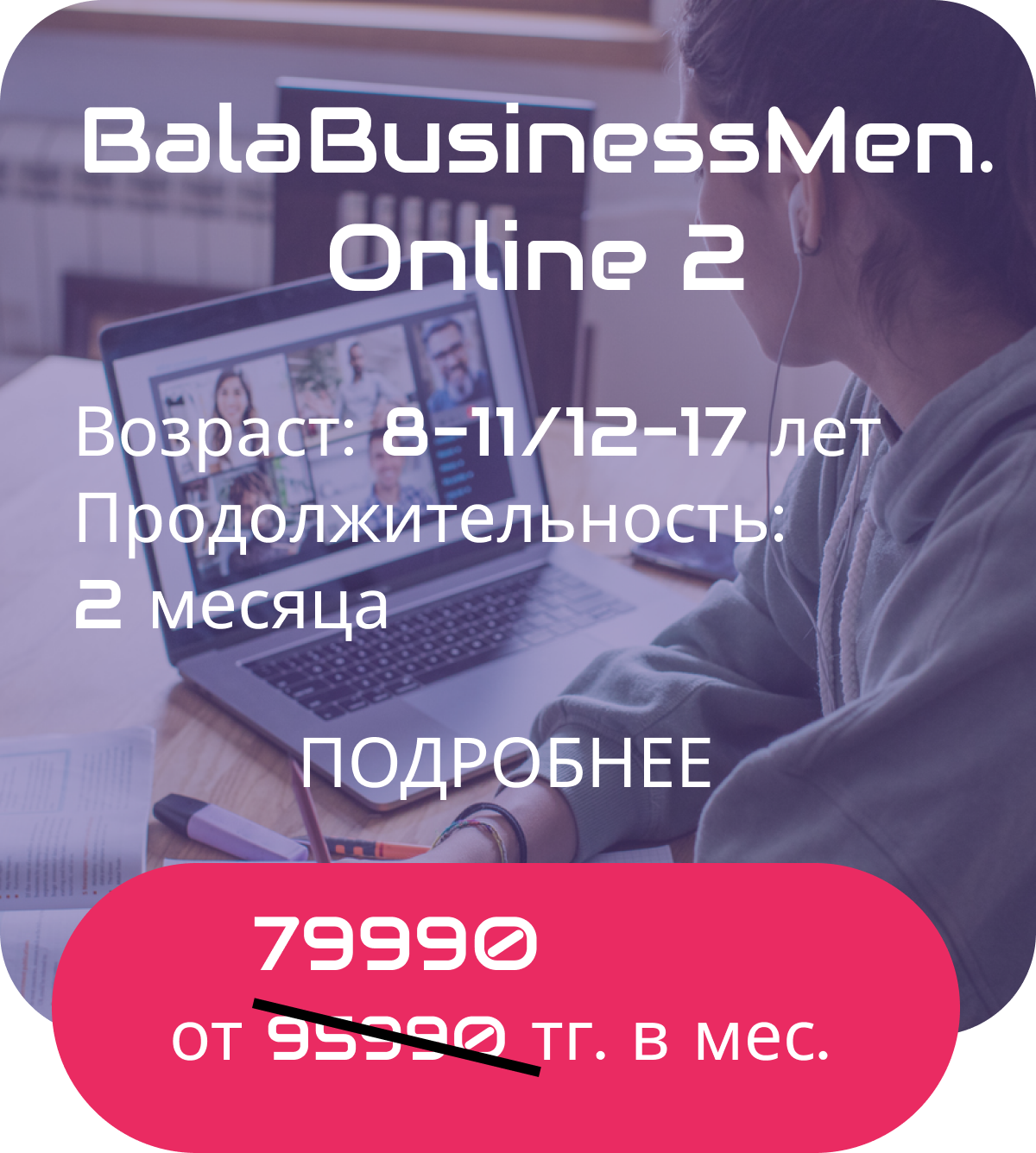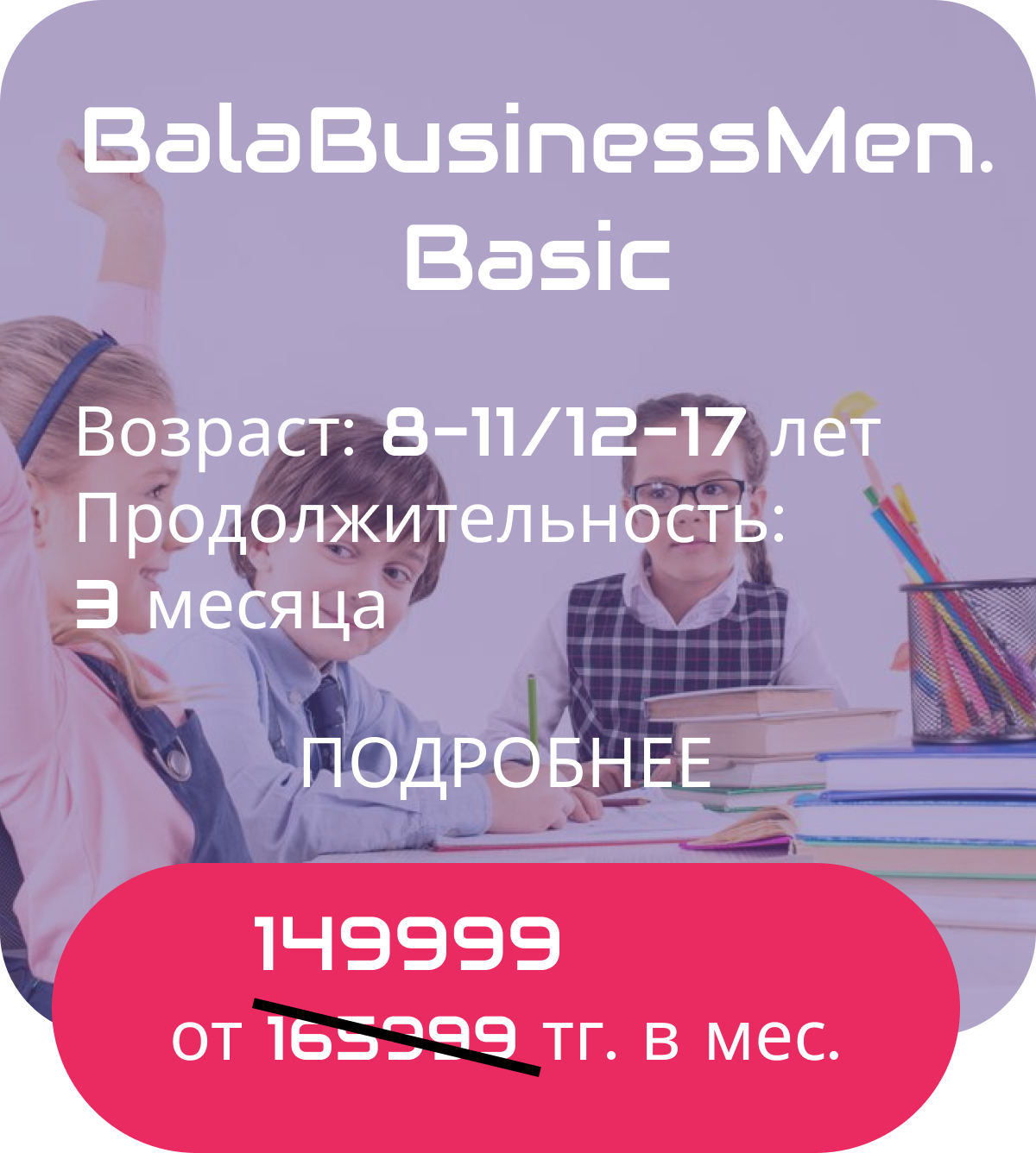 Длительность: 6 месяцев Количество занятий в неделю: 2 Длительность занятий: 2 академических часа Возраст: 8-11/12-17 лет Стоимость стандартного пакета в месяц: 499999 тг. Стоимость VIP пакета в месяц: 1499990 тг.