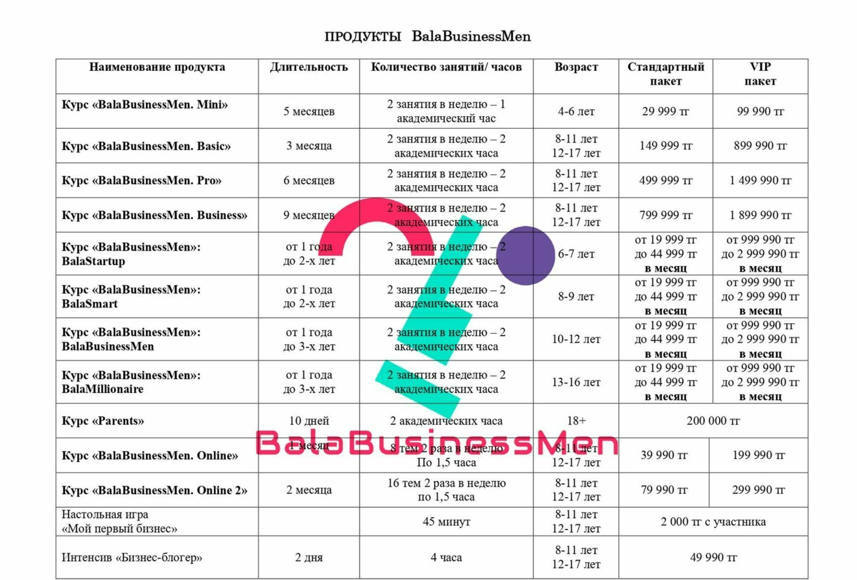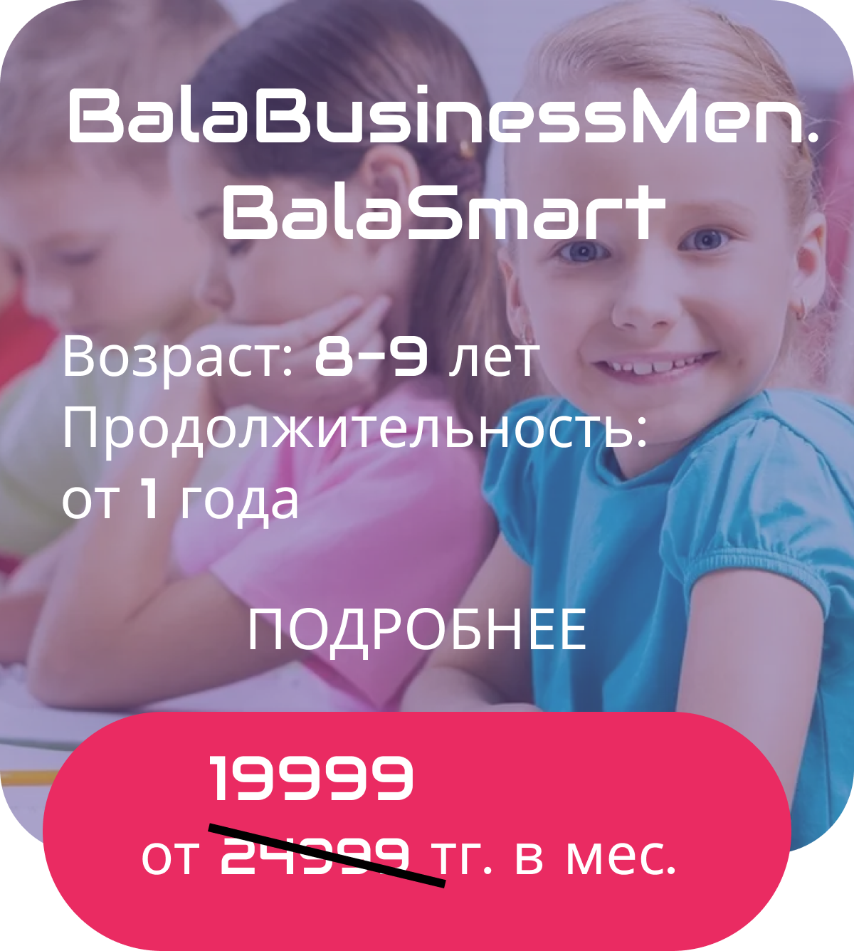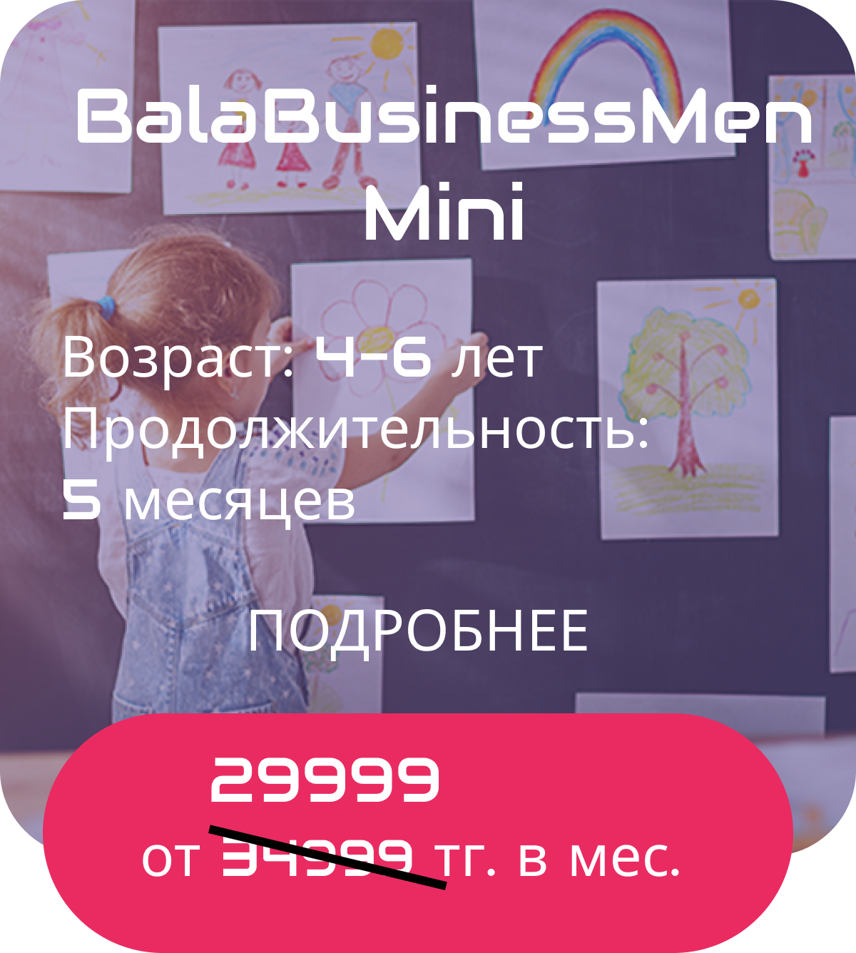 Длительность: 5 месяцев Количество занятий в неделю: 2 Длительность занятий: 1 академический час Возраст: 4-6 лет Стоимость стандартного пакета в месяц: 29999 тг. Стоимость VIP пакета в месяц: 99990 тг.